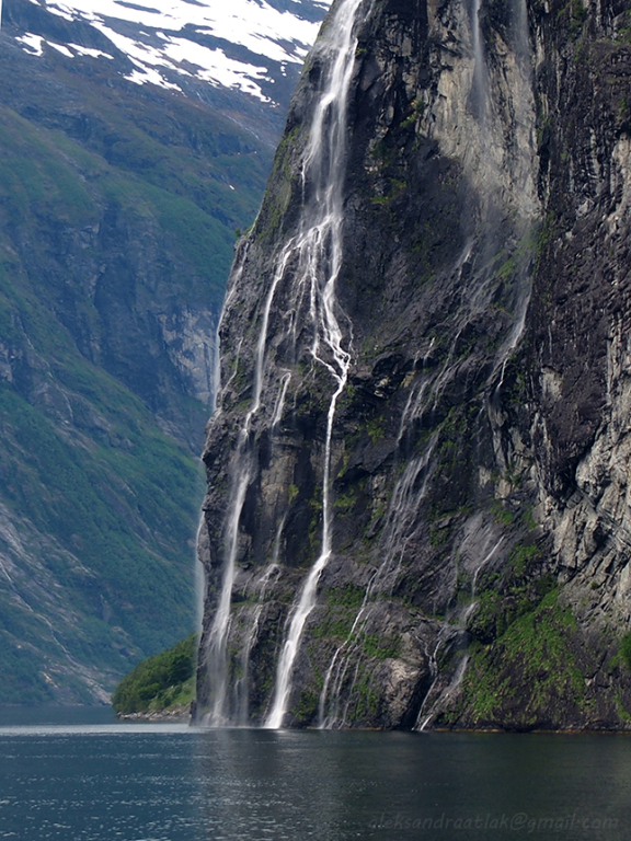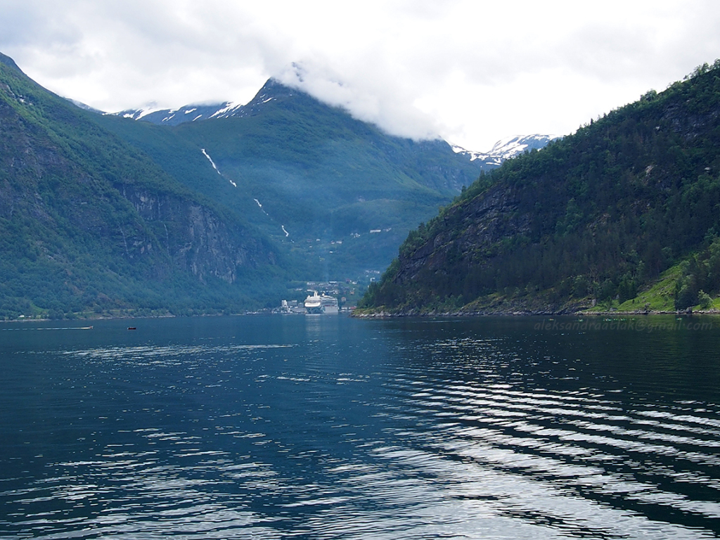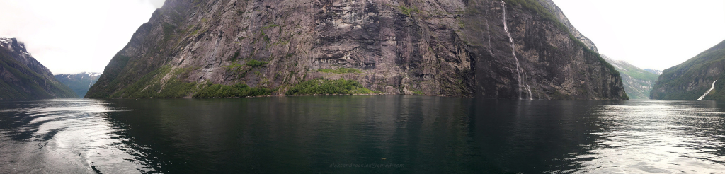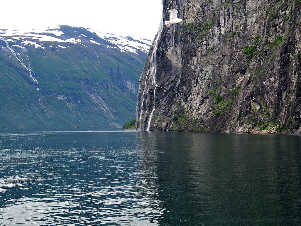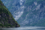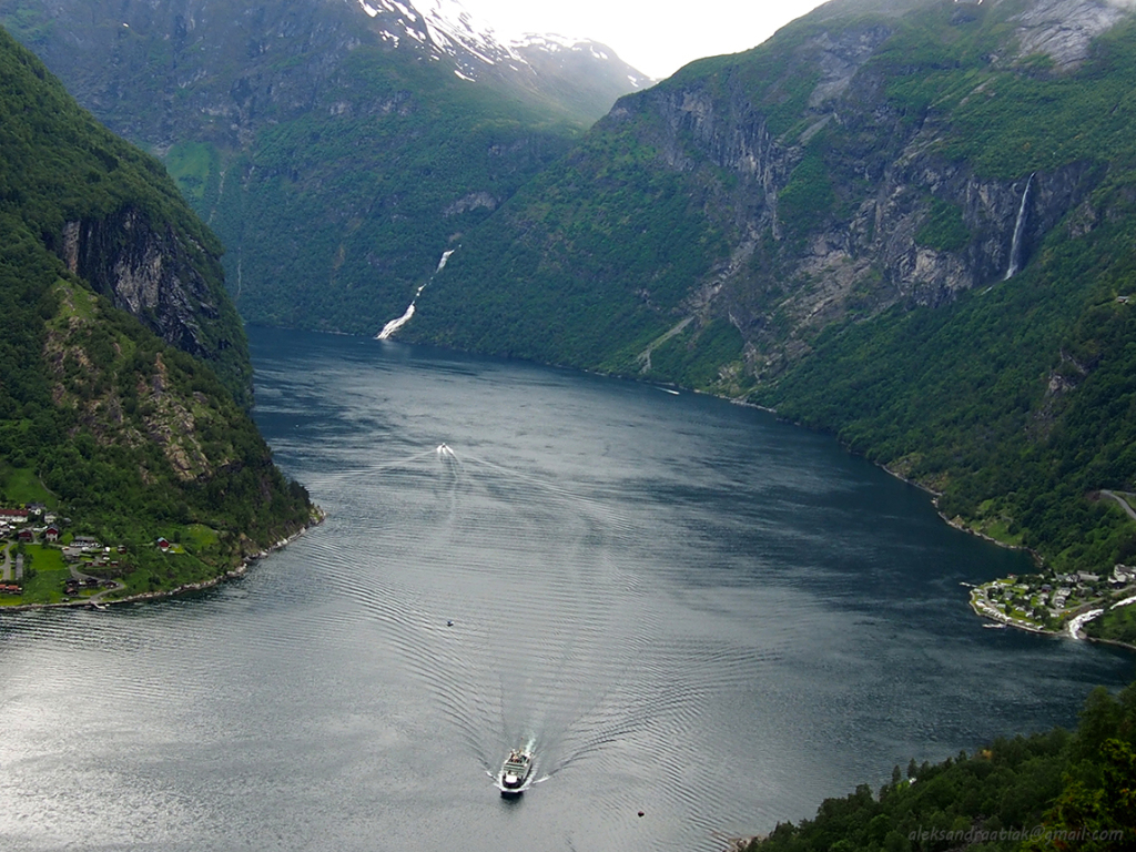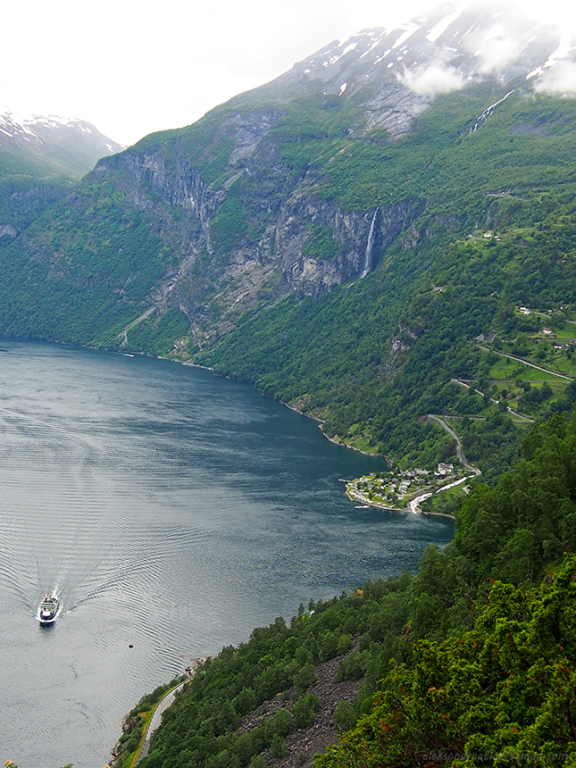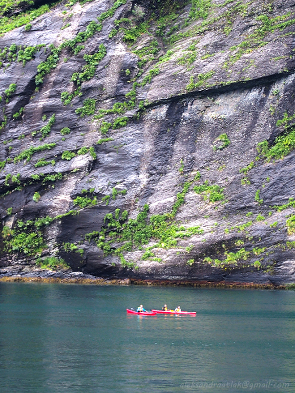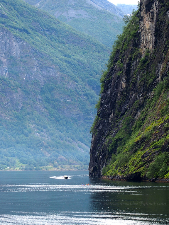Słusznie Geirangerfjord jest zaliczany do największych cudów świata, JUST MUST SEE...Uderza mnie kontrast potęgi fjordu, głębokości 300m i unoszących się na wodzie małych jednostek pływających, kajaków czy łódek z wędkarzami. Fjord jest wąski i stromy. Mimo ciasnych przewężeń jego głębokość pozwala wpłynąć tu pełnomorskim statkom. Przez cała drogę do wioski Geiranger natura serwuje turystom widoki, nie z tej ziemi, standardem staje się bieganie od burty do burty, żeby absolutnie niczego nie przeoczyć;-).