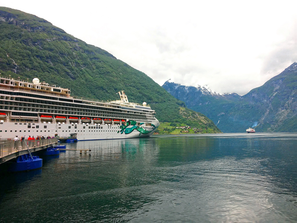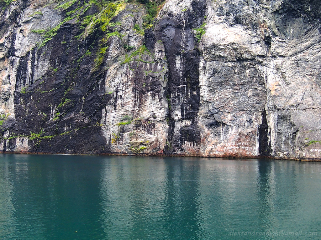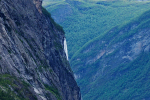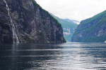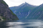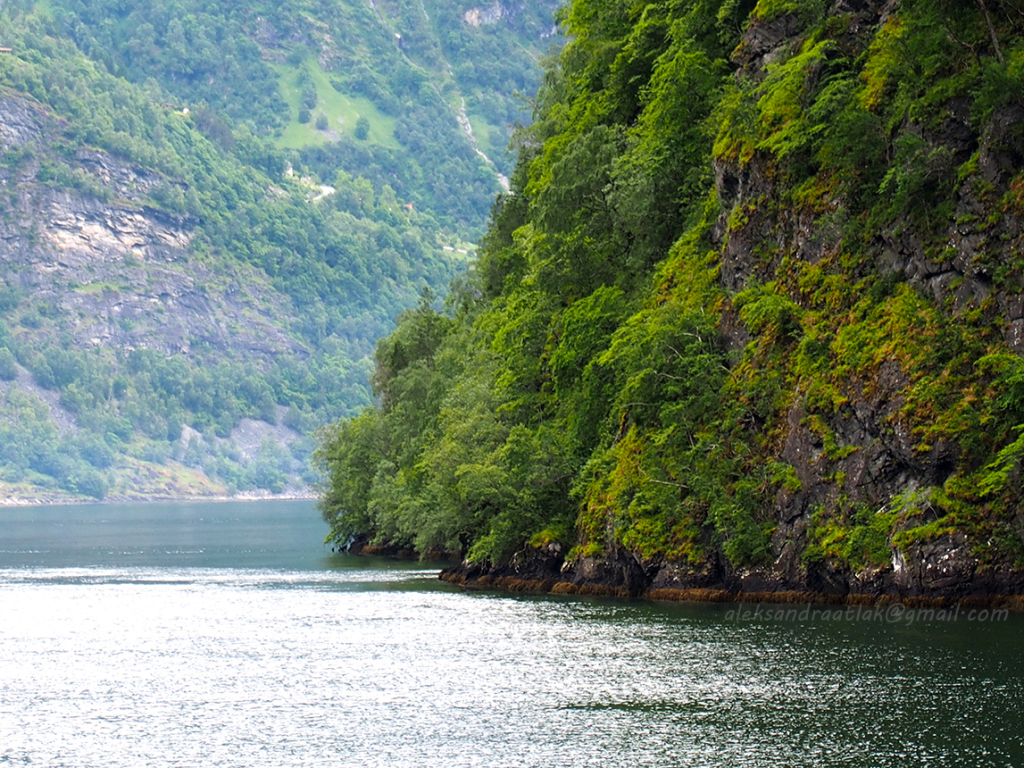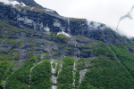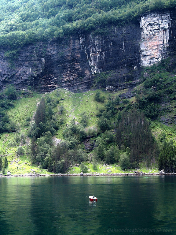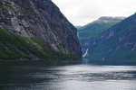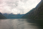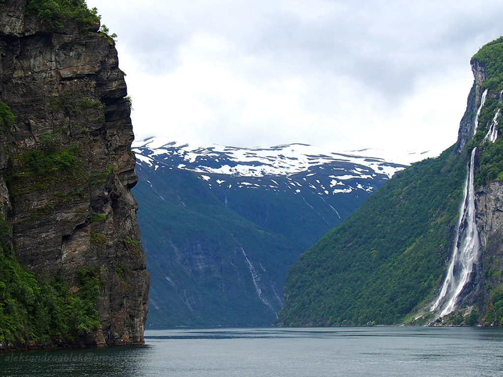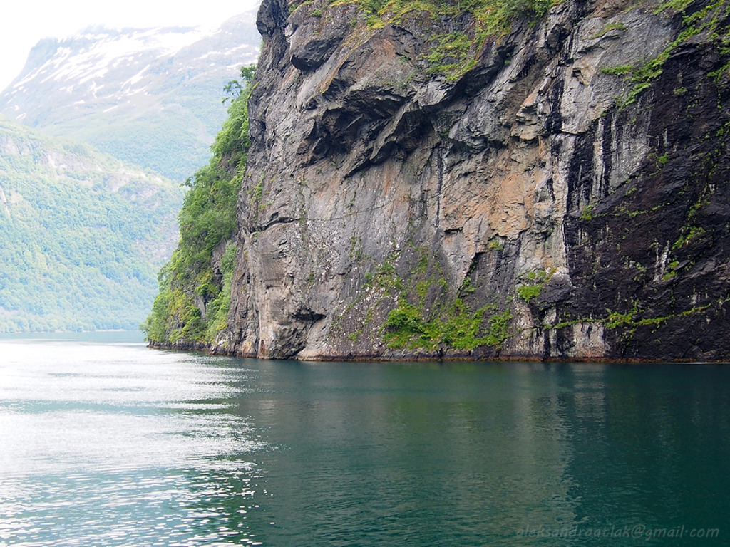 Słusznie Geirangerfjord jest zaliczany do największych cudów świata, JUST MUST SEE...Uderza mnie kontrast potęgi fjordu, głębokości 300m i unoszących się na wodzie małych jednostek pływających, kajaków czy łódek z wędkarzami. Fjord jest wąski i stromy. Mimo ciasnych przewężeń jego głębokość pozwala wpłynąć tu pełnomorskim statkom. Przez cała drogę do wioski Geiranger natura serwuje turystom widoki, nie z tej ziemi, standardem staje się bieganie od burty do burty, żeby absolutnie niczego nie przeoczyć;-).