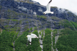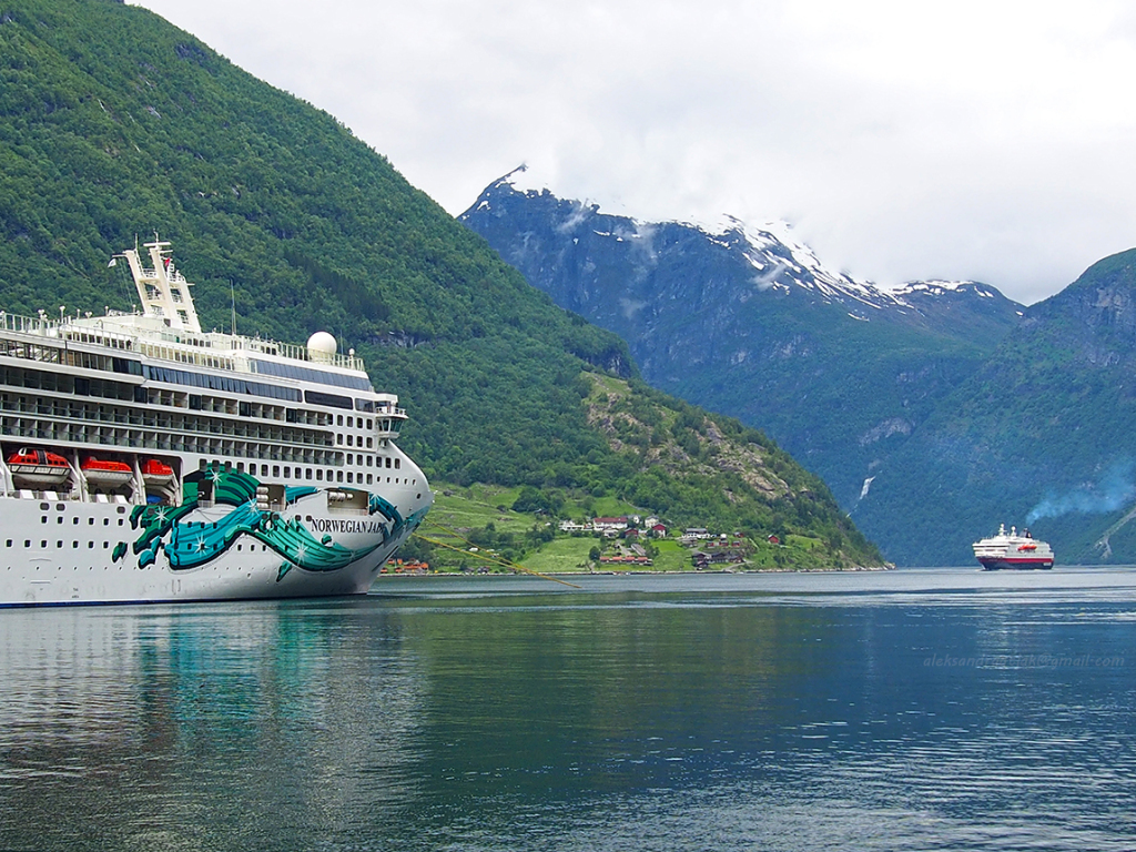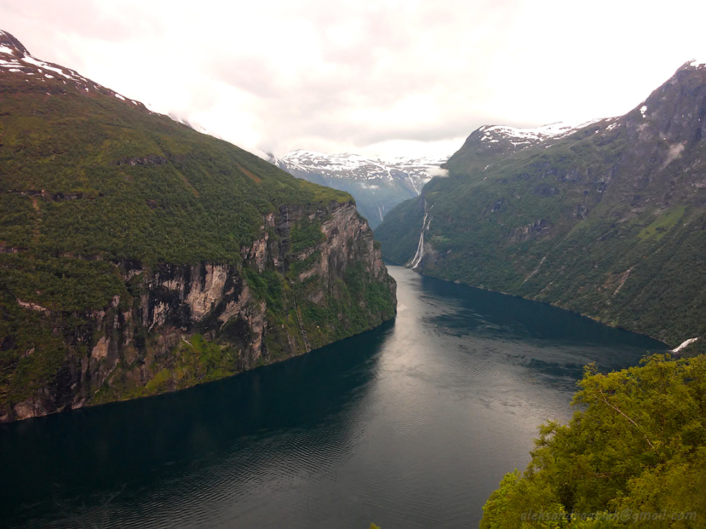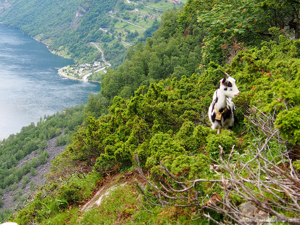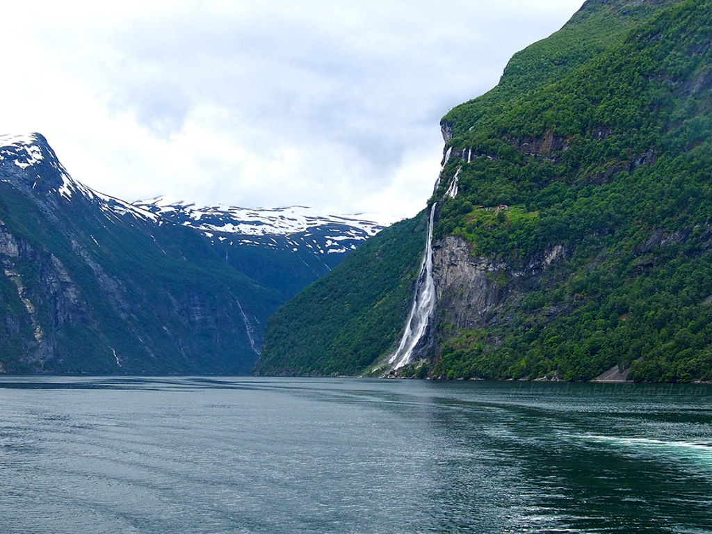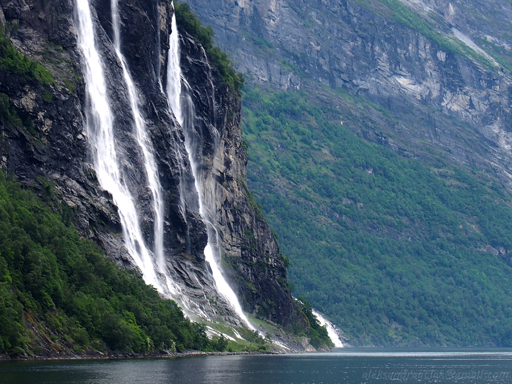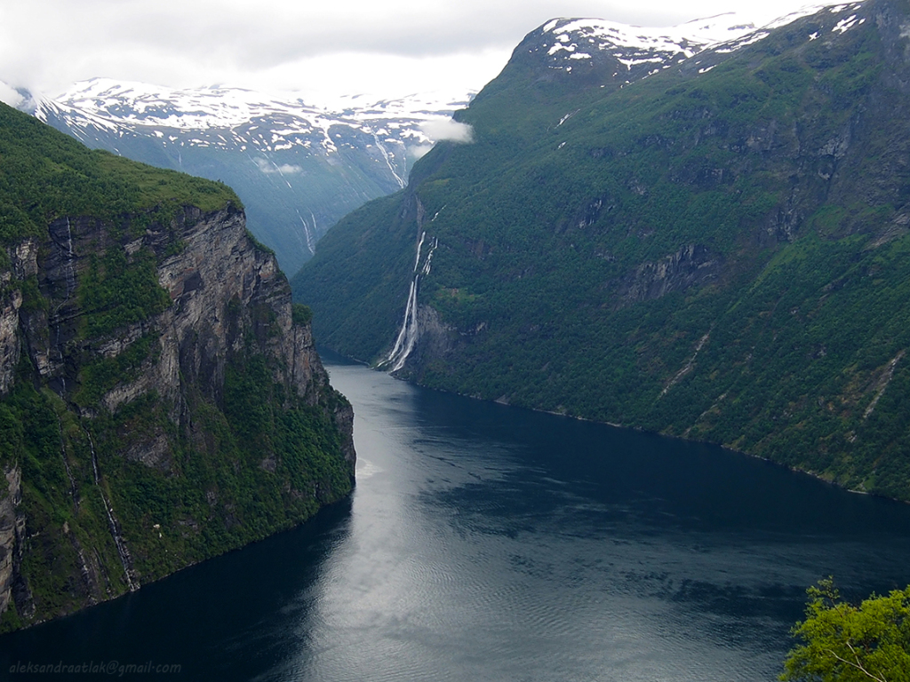 Słusznie Geirangerfjord jest zaliczany do największych cudów świata, JUST MUST SEE...Uderza mnie kontrast potęgi fjordu, głębokości 300m i unoszących się na wodzie małych jednostek pływających, kajaków czy łódek z wędkarzami. Fjord jest wąski i stromy. Mimo ciasnych przewężeń jego głębokość pozwala wpłynąć tu pełnomorskim statkom. Przez cała drogę do wioski Geiranger natura serwuje turystom widoki, nie z tej ziemi, standardem staje się bieganie od burty do burty, żeby absolutnie niczego nie przeoczyć;-).
