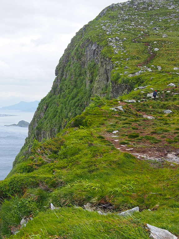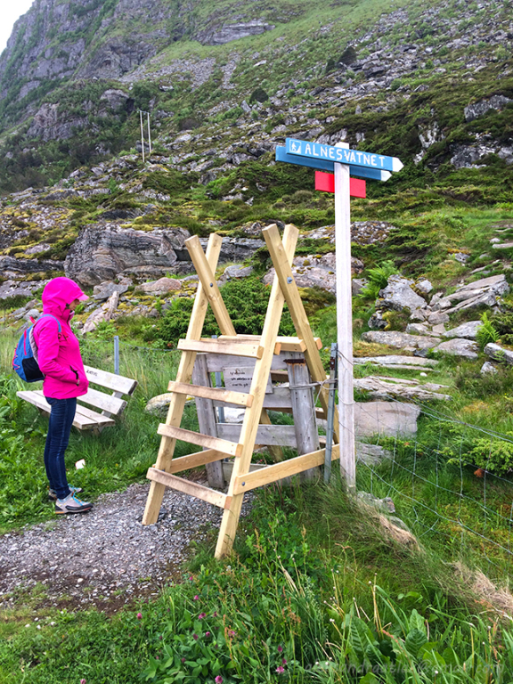 19.06. Ostatni dzień pobytu. Dzięki uprzejmości gospodarza, zostaję dłużej w mieszkaniu nie zwracając uwagi na koniec "doby hotelowej". o 09:55 łapię autobus na wyspę Godoy z przesiadką w Yterland. Autobus wiezie mnie tunelem pod Stormhornet aż do słynnej latarni morskiej. Drogę na szlak nie trudno znaleźć. Drewniana podwójna drabina sygnalizuje jej początek.