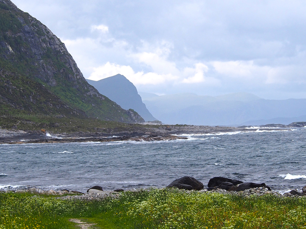 Pierwotnie celem był Stormhornet. Brak czasu i wiatr nie pozwala iść dalej. Szybko orientuję się, że sama droga staje się celem:-) Cieszę oczy widokiem urwisk skalnych, fjordów i serfującego w zatoce śmiałka.