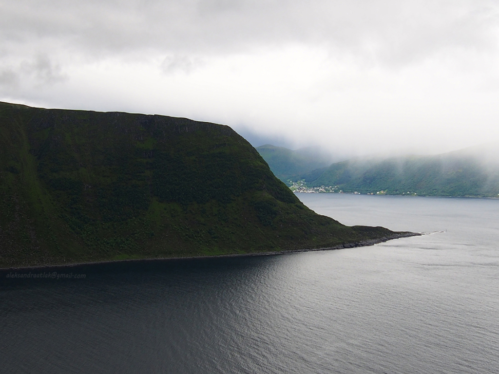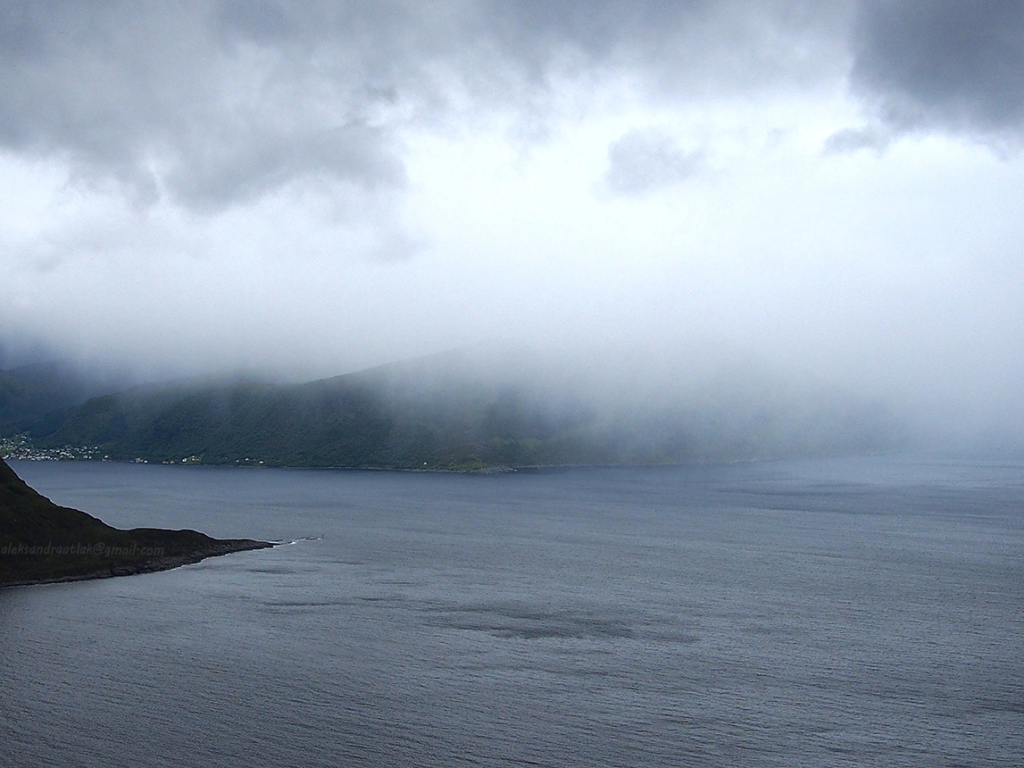 Szlak na wzgórze Sukkertoppen jest rzadziej uczęszczany przez turystów. Powstałe błoto po deszczu utrudnia wędrówkę. Widok ze szczytu jednak rekompensuje trudy szlaku. Jest kompilacją fjordu, licznych wysp, często niezasiedlonych, oceanu i Alp. Na szczycie jestem 353...formalnie. Skąd to wiem? Z zeszytu, ktory jest miłą niespodzianką. Poczyniam wpis o godz. 19:45, czasu lokalnego. Wiatr dmie coraz bardziej. Coraz trudniej utrzymać równowagę na mokrych korzeniach i błocie. Po zejściu ze szlaku, łapię autobus na Holmegata. Kolejny owocny dzień uważam za zakończony.