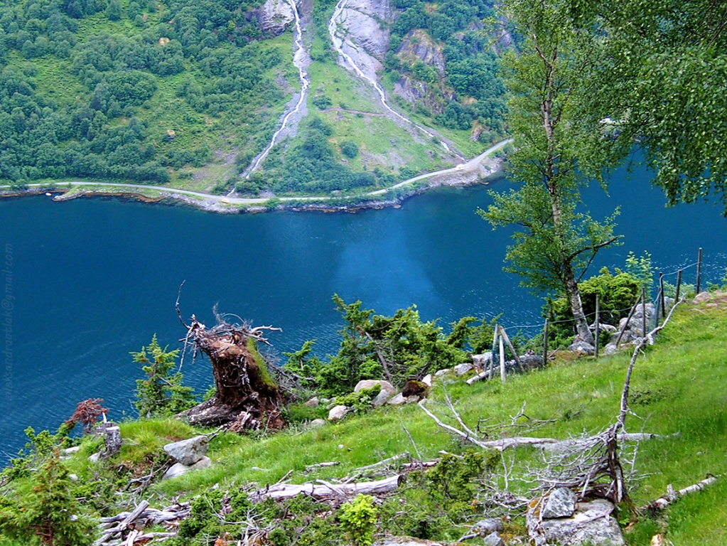 18:45 wracam do Alesund. Widok z Losta na wioskę i ze szczytu Dalsnibba na drogę Troli pozostawiam na kolejny wypad. A niech pozostanie niedosyt:-) Autobus obiera inna trasę powrotu, droga nr 63, Droga Orłów, subiektywnie, najbardziej niebezpieczna droga jaką jechałam. Ogromny autokar ma do pokonania 8 kilometrowy odcinek z mnóstwem serpentyn, o kącie nachylenia 10st.i ułożenia drogi względem siebie 180st. Z myślą o turystach przygotowano tu kilka punktów widokowych, z których rozpościera się wspaniała panorama Geirangerfjord (punkt Skywalk).
